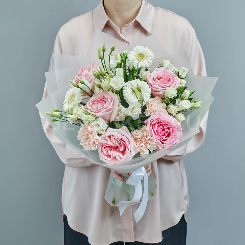 Букет из белых роз, гвоздик и эустомы13 350 ₽Букет из белых роз, гвоздик и эустомы 13 350 ₽ -